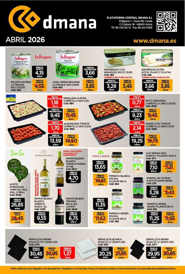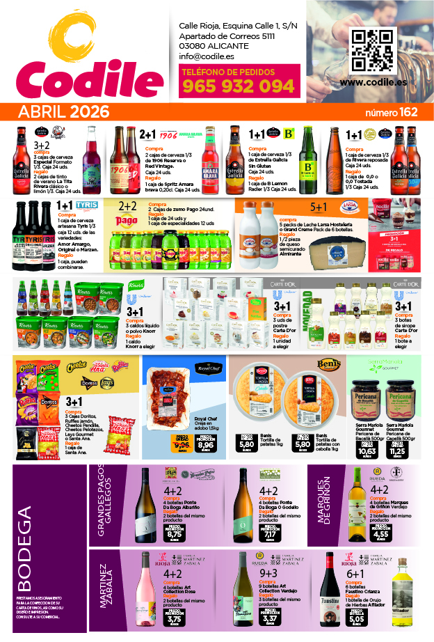 Promociones y Catálogo Ofertas del mes Codile y Dmana Catálogo bebidas Catálogo completo cervezas * CATÁLOGO COMPLETO CERVEZA Catálogo lácteos * CATÁLOGO LÁCTEOS Catálogo completo aguas * CATÁLOGO COMPLETO AGUAS Catálogo bebidas alcohólicas * CATÁLOGO BEBIDAS ALCOHÓLICAS Catálogo completo refrescos, zumos y sidra * CATÁLOGO COMPLETO REFRESCOS, ZUMOS Y SIDRAS Catálogo vinos, cava y vermut * CATÁLOGO VINOS, CAVA Y VERMUT Catálogo alimentación, café e higiene Catálogo completo cervezas * APERITIVOS * TAPAS Y V GAMA * CONSERVAS VEGETALES, PESCADO Y SALAZONES * JAMONES Y EMBUTIDOS * QUESOS * CALDOS Y POSTRES Catálogo cafés * CATÁLOGO COMPLETO CAFÉ, COMPLEMENTOS Y DESAYUNOS Catálogo higiene * CATÁLOGO COMPLETO DE LIMPIEZA, HIGIENE Y DROGUERÍA Catálogo completo Codile